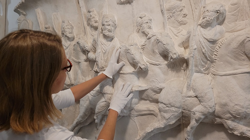 Eine behandschuhte Hand ertastet das Gesicht einer antiken Statue