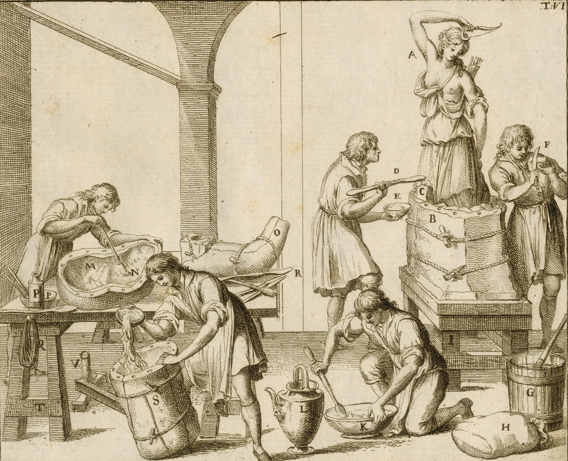 Um einen Abguss herzustellen, benötigt man zuerst eine Negativform. Solche Formen wurden jahrhundertelang aus Gips hergestellt. Da dieses Material starr und unflexibel ist, wird die Oberfläche des Originals mit Hilfe vieler Einzelteile abgeformt. Hierbei ist es wichtig, die einzelnen Formen so anzulegen, dass sie sich ohne Schaden von der Oberfläche lösen lassen und haargenau zu den benachtbarten Teilformen passen.