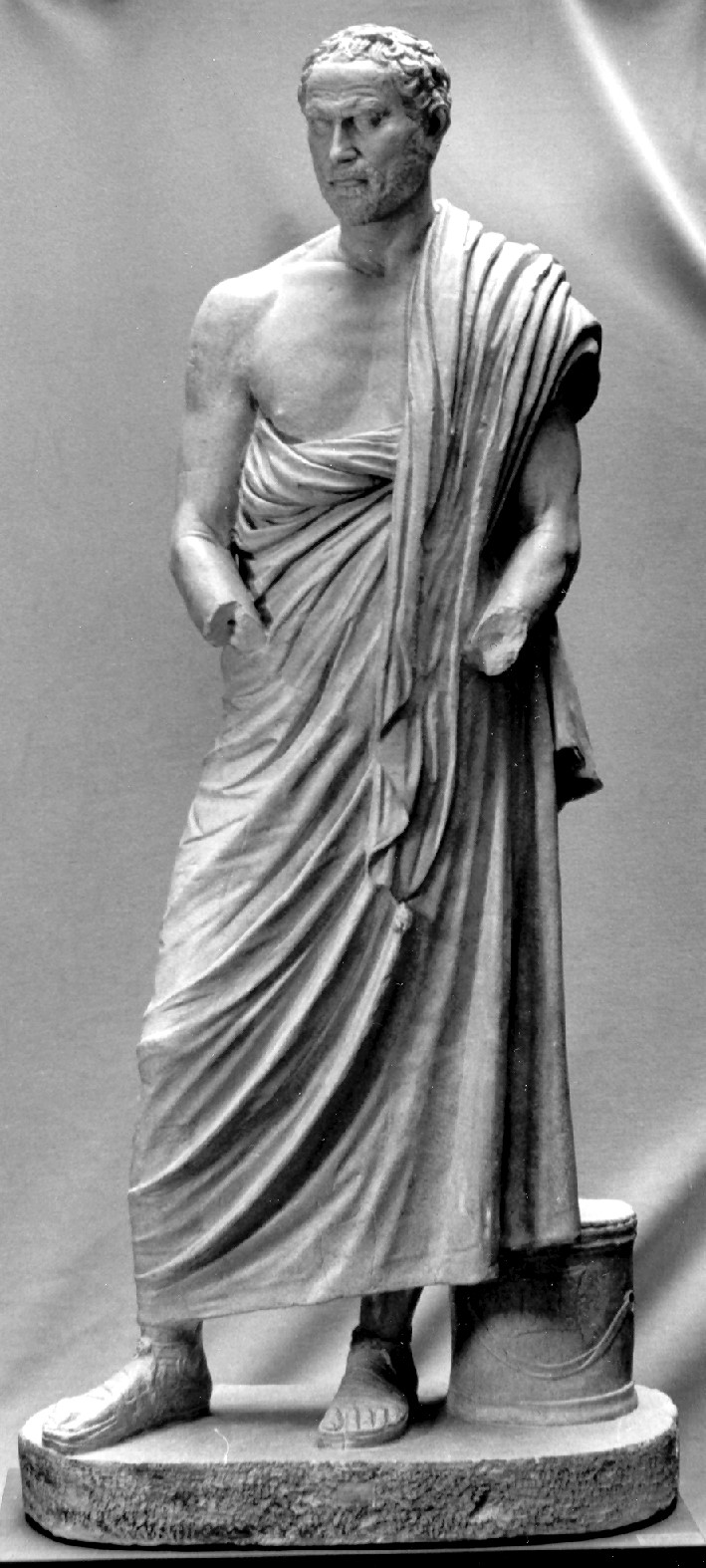 In Haltung und Mimik wird somit das Bild eines engagierten Intellektuellen vorgeführt, der sich für seine Polis einsetzt.