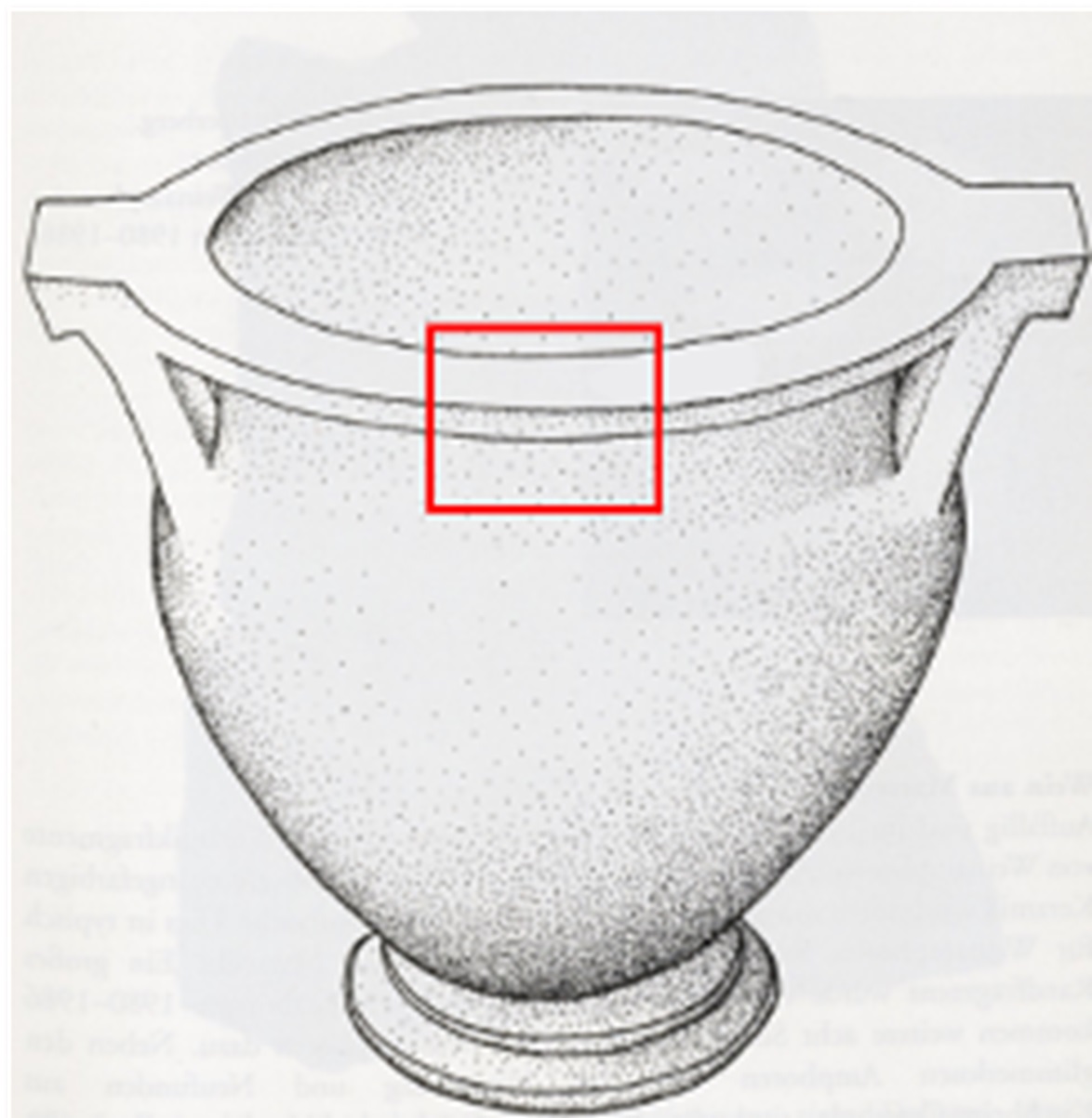 Das Fragment ist aus zwei Scherben zusammengesetzt und stammt von der Mündung eines Kolonettenkraters. Die ursprüngliche Position entspricht dem roten Rechteck in der Rekonstruktionszeichnung. Der Durchmesser der Kolonettenkrater-Mündung lag bei circa 46 cm.