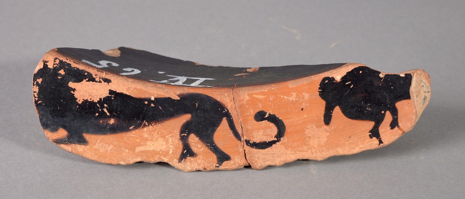 Rechts vom Löwen steht ein nach rechts ausgerichteter Eber. Am Hinterbein ist der für einen Eber typische, hervorstehende Knochen zu sehen. Am Hinterteil des Tieres sitzt ein misslungener Ringelschwanz. Während bei ähnlichen Darstellungen stets eine tongrundige freie Fläche in der Mitte des Schwanzes freigelassen wurde, wurde hier die leere Fläche beim Ringelschwanz vermutlich versehentlich übermalt.