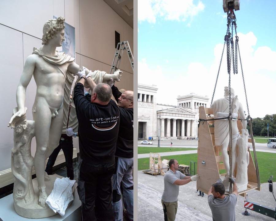 Figuren aus Gips stellen eine sehr komplizierte Fracht dar. Denn die Abgüssen bestehen nur aus einer dünnen Schale und sind hohl. Jede Erschütterung kann zu Rissen in der Wandung führen. Transportkisten werden daher innen sorgfältig mit Schaumstoffplatten und Polstern ausgekleidet.